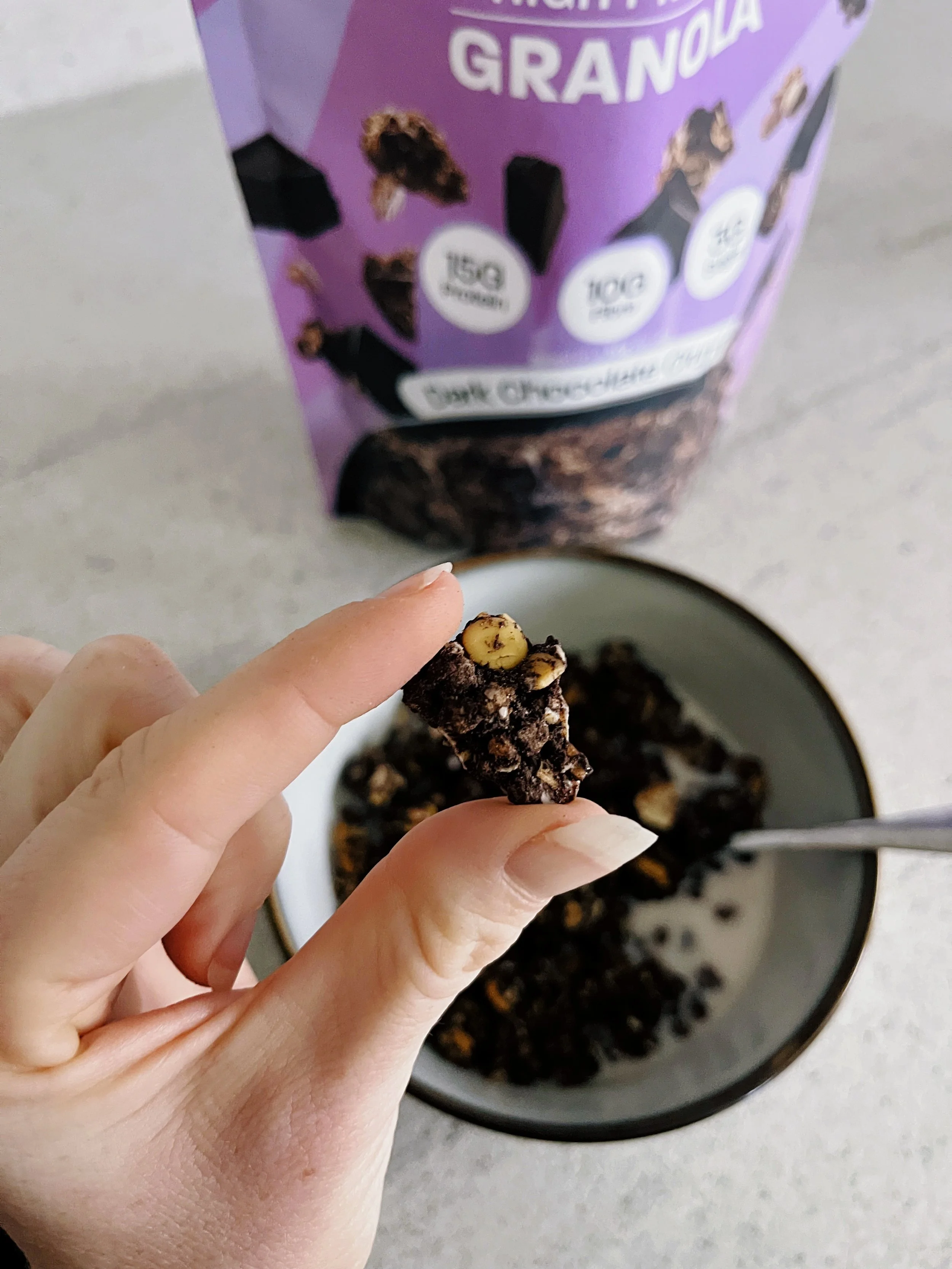 It includes crispy protein pieces that give real texture and help the bowl feel more substantial. The Dark Chocolate granola even holds its crunch in milk, so it works whether you’re pouring it over a bowl or stirring it into yoghurt.