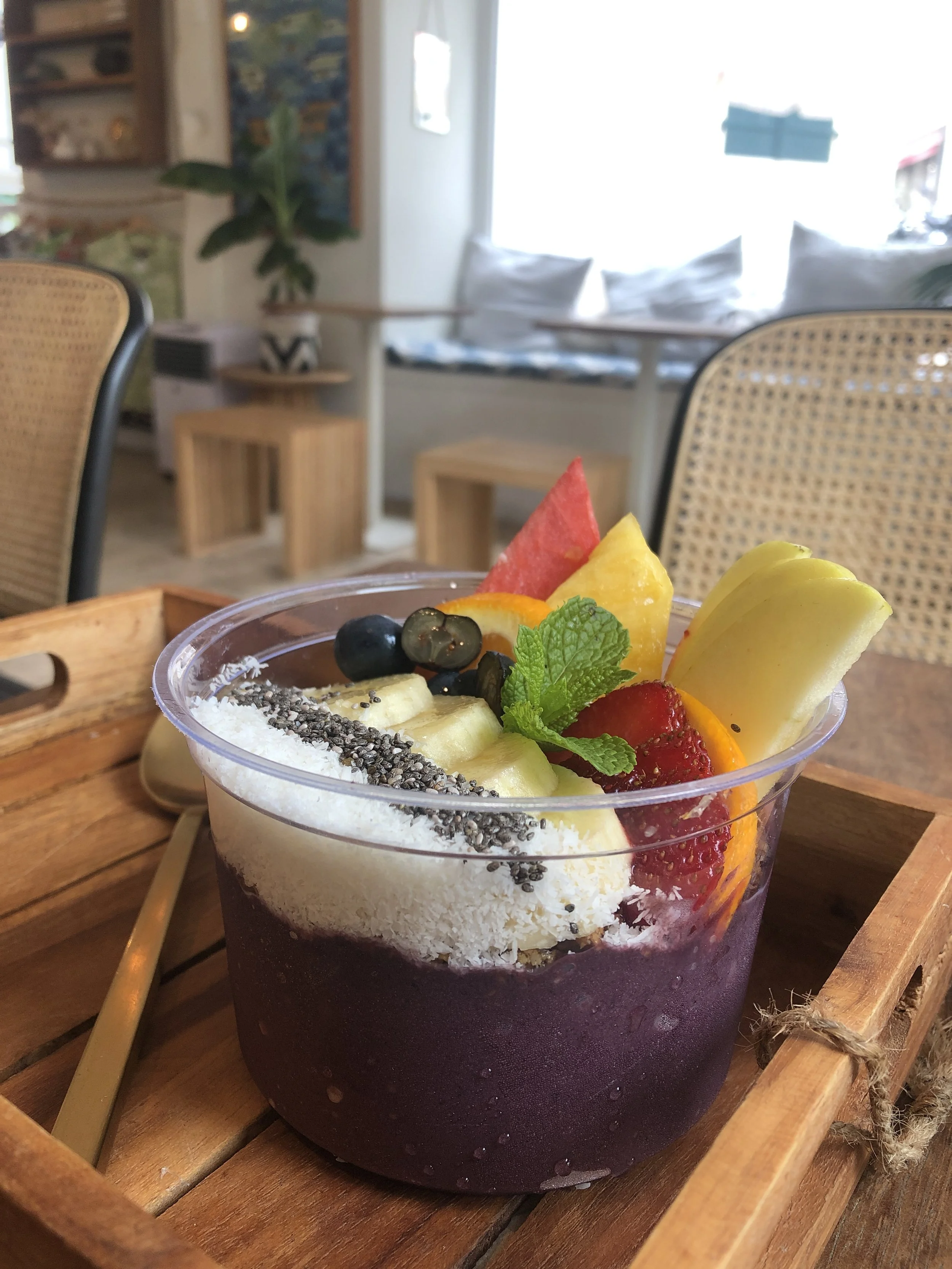 I had the classic acai bowl called Belharra, topped with coconut, granola and fresh fruit. It was delicious and tasted like proper acai.